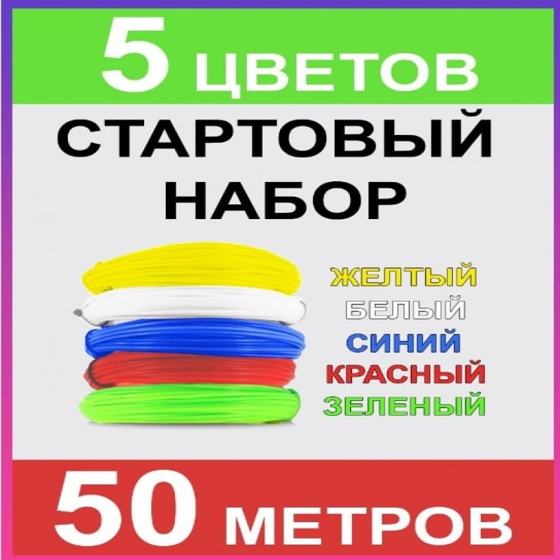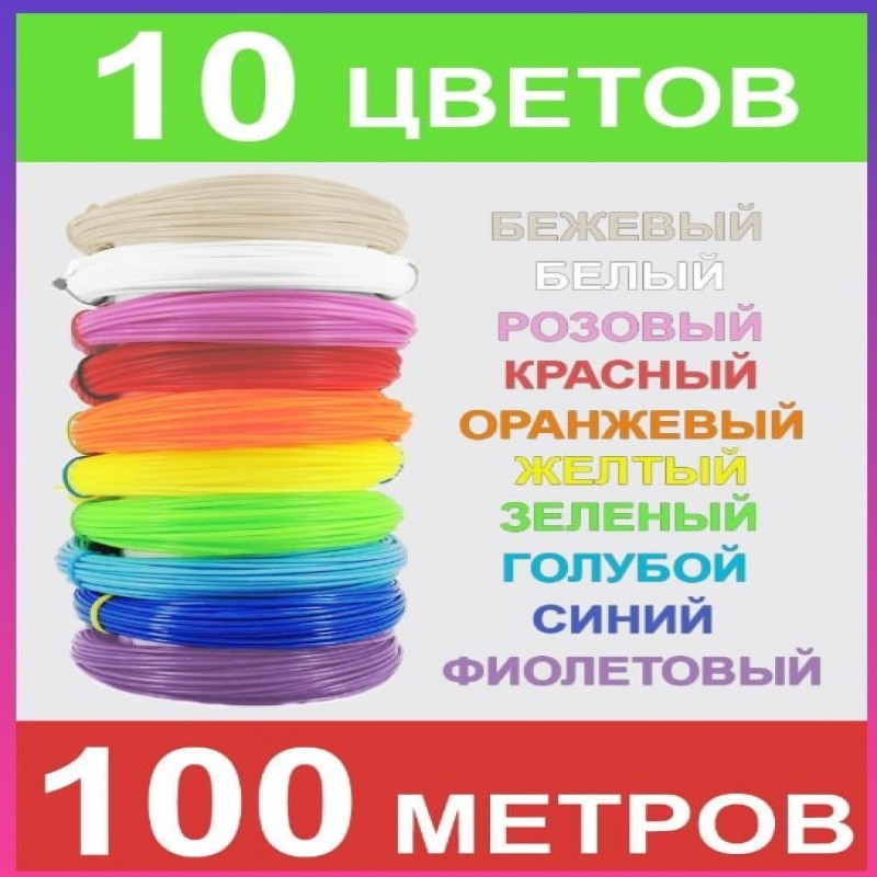 | Комплектация | пластик для 3д ручки; пластик для 3D ручки; набор пластика для 3д печати 100 метров: 10 цветов по 10 метров |