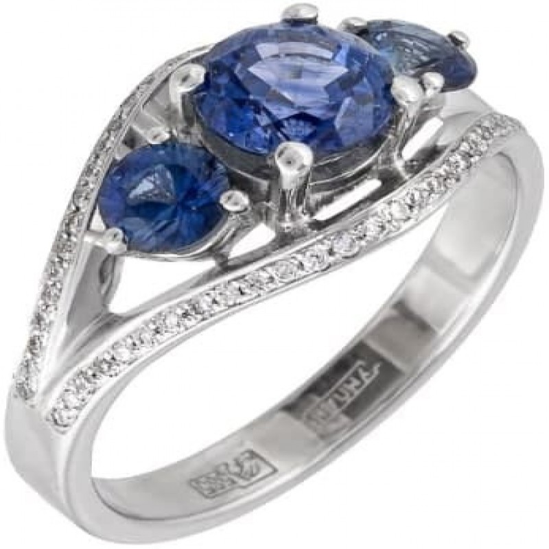 **Обалденное золотое кольцо с тремя идеальными сапфирами по цвету и чистоте.** Центральный камень весом 1,02 карата и диаметром 5,5 мм. Боковые сапфиры по 0,27 карата диаметром по 3,8 мм. В обрамлении двух бриллиантовых дорожек из якутских бриллиантов. Шинка внизу кольца шириной 3,0 мм. Ширина декоративной части 10 мм. Вставка из природных натуральных драгоценных камней сапфиров и бриллиантов (Бриллианты АЛРОСА, Якутия): 59 брл Кр-57 0,180Ct 3/6 ,1 спф Кр 1,020Ct 1/1 ,2 спф Кр 0,540Ct 1/1