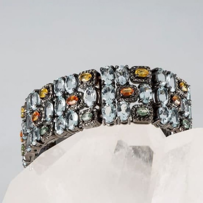 Размер изделия: 195мм*21мм Камень: Сапфир Краткое описание камня: Сапфир - разновидность благородного корунда. Как и рубин, он принадлежит к первой группе драгоценных камней, и является вторым по твердости после алмаза. На рынке сапфиры ценятся очень дорого. В 2014 году камень "Голубая красавица Азии", весом в 392 карата, был продан на аукционе Christie`s за 17 млн. долларов (44 тыс. долларов за карат). Наиболее известные сапфиры добывались в Кашмире, но на сегодняшний момент месторождение исчерпало себя, поэтому не верьте тому, кто будет продавать Вам "Кашмирские" сапфиры, если только это не старая реликвия. Сегодня сапфиры хорошего качества добывают на острове Шри-Ланка. Топовые цвета - "Королевский синий" ("Royal blue") и "Василек" ("Cornflower"). "Василек" при этом - более яркий и ценится выше. Во всеобщем представлении, сапфир - синий камень, но бывают сапфиры также желтых, розовых, "фантазийных" расцветок. Этот камень всегда был "королевским" любимцем, а новый всплеск интереса к нему случился после помолвки английского принца Уильяма и Кейт Миддлтон, в обручальном кольце которой сиял чистейший сапфир. Сегодня льдистый прохладный камень относится к наиболее желанным украшениям всех девушек мира. Лечебные свойства: Камень понижает давление, очищает кровь. Оправа из серебра помогает победить ревматизм, боли в пояснице, заболевания позвоночника. В виде кулона он нормализует сердечный ритм, лечит заболевания легких. Подходит по знаку Зодиака: Сапфир подходит всем знакам Зодиака, но особенно благоприятно повлияет на Стрельцов, Раков, Рыб и Львов. Носить его рекомендуется также, Весам. Магические свойства: Буддисты верят, что сапфир помогает сбываться желаниям. Он успокаивает, бережет от вспышек гнева. Главное свойство этого камня - он может выступать оберегом, отталкивая злость и зависть, и даже нейтрализуя черную магию. Камень: Топаз Краткое описание камня: Топаз - один из самых популярных драгоценных камней в ювелирном искусстве. По твердости он уступает только алмазу и корунду. Прозрачность и бриллиантовый блеск граней делают его удивительно привлекательным для коллекционеров. Название камень получил в честь острова Топазос в Красном море. Люди знали этот камень еще в древние времена. Так, Библия гласит, что топаз составлял часть украшения первосвященника Аарона. Королевские дворы Европы также выбирали этот камень для ювелирных коллекций. Известен, например, камень "Браганза", входящий в число регалий португальской короны. Цветовая гамма этого драгоценного камня разнообразна: существуют розовые, желтые, голубые, фиолетовые, винные топазы. Голубые топазы принято разделять на три категории в зависимости от интенсивности окраски (обычно достигаемой за счет облучения): Sky Blue - небесно-голубые, Swiss Blue - швейцарские, с более насыщенным цветом, и London Blue - лондонские, с наиболее глубоким оттенком синевы. Лечебные свойства: Топаз предохраняет от простуды, ускоряет регенерацию тканей, оздоравливает органы пищеварения, печень, желчный пузырь и селезенку. А голубой топаз в кулоне и серьгах благотворно влияет на щитовидную железу. Подходит по знаку Зодиака: Топаз подходит Скорпионам. Но в целом, этот камень достаточно нейтрален и хорошо уживется со всеми знаками Зодиака. Магические свойства: Топаз дарит хозяину хорошее настроение и оптимизм. Это камень гармонии и вну