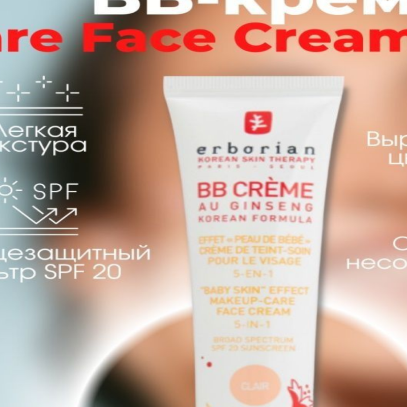 Многофункциональный BB Cream Clair 5 в 1 для воссоздания эффекта кожи младенца. Легкая, шелковистая, тающая текстура окутывает кожу мягкой вуалью, скрывает несовершенства и создает эффект естественно безупречной кожи. Благодаря комплексу с Корейским Женьшенем крем превосходно тонизирует и наполняет кожу энергией, корректирует тон кожи, маскирует недостатки, улучшает текстуру кожи, увлажняет и даже блокирует УФ-лучи, обеспечивая безупречную кожу. Гипоаллергенная формула подходит для всех типов кожи, даже для самой чувствительной.ВВ -крем для лица содержит ингредиенты центеллы азиатской, которые успокаивают чувствительную кожу, защищают кожу от влаги и корректируют тон кожи, не вызывая чувства стянутости.BB-крем "Абсолютная чистота" 5 в 1 SPF 20 Erborian BB Cream «Baby Skin» Effect Makeup - Care Face Cream 5 in 1 Nude с легкой текстурой и универсальным тоном выравнивает цвет лица, скрывает несовершенства кожи, дает невероятный эффект «кожи младенца», делает ее более мягкой, гладкой, бархатистой, матовой, не требует предварительного нанесения основы под макияж. Благодаря растительным экстрактам, жирным кислотам, полисахаридам, бетаину, крем обладает высокими уходовыми качествами, он интенсивно увлажняет и питает кожу, повышает ее тонус, замедляет процессы увядания. Мягкий солнцезащитный фильтр SPF 20 оберегает кожу от негативного влияния ультрафиолета,и,как следствие преждевременного фотостарения.Подходит для всех типов кожи.Применение: 1. Нанесите несколько капель BB крема на кожу лица. 2. Равномерно распределите и массируйте до тех пор, пока крем полностью не подстроится к вашему типу кожи. Крем покрывает кожу тонкой вуалью при соприкосновении с ней, при этом не забивает поры, позволяя коже дышать. 3. Результат: безупречная и идеально ровная кожа, мягкая и бархатистая, без эффекта маски. Свернуть описание вода, глицерин, дипропиленгликоль, циклопентасилоксан, ромашки экстракт, цинка оксид, розмарина экстракт, диоксид Развернуть составСостав