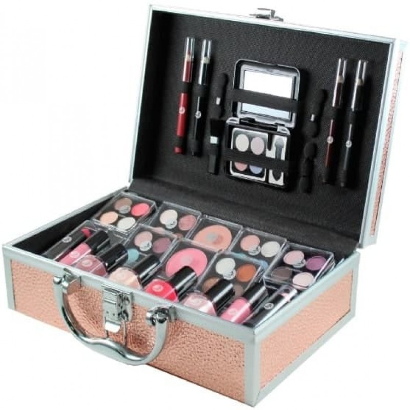 Мой первый косметический набор - лучший подарок для девочек, начинающих пользоваться косметикой. В чемоданчике есть все необходимое для созданиявыразительных и ярких черт лица, для коррекции овала, скул и губ. Двадцать четыре оттенка теней для век с широким цветовым спектромпомогут создать любой образ - от тотального NUDE до классического Смоки Айс. Румяна модных в этом сезоне оттенков - морозный румянец и нежныйперсик. Два оттенка помады для губ - насыщенный красный и фламинго - поддержат любой ваш образ. Для любителей глянца предусмотрены два блеска для губ модных в этом сезоне чувственных оттенков. Также в комплекте есть три карандаша для глаз - черный, коричневый и цвет дождя, один карандаш для губ цвета пыльнойрозы. В наборе предусмотрены кисть для румян и три аппликатора для теней и помады, модных оттенков лака для ногтей - спелая вишня, пыльная роза, нюдовый икоралловый. Чемоданчик оснащен зеркалом и футлярами для теней. Отличный подарок на все случаи жизни.