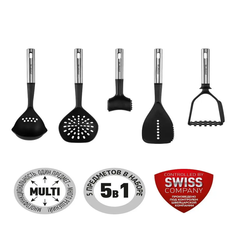 | Комплектация | лопатка; половник; картофелемялка; шумовка; молоток для мяса |