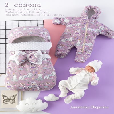 В набор для новорожденного водит: - конверт трансформер 72/40 см.(от 0 до 5 мес.) - утеплённый комбинезон для малыша 56-68 р. нательный комбиезон (слип) 56-62 р. шапочка для малыша. Конверт для малыша можно использовать конверт на выписку и для прогулок в коляске. Состав: дюспо (непромокаемая и непродуваемая ткань), холлофайбер 400гр., подклад из нежнейшего хлопка. Этот комплект для малыша - всесезонний: весной и осенью используется конверт или комбинезон по отдельность в зависимости от погоды, зимой - конверт + комбинезон. Конверт используется при температуре от +15 до -5, с комбинезоном от 0 до -25 градусов, Вы можете варьировать утепленность малыша при помощи комбинезона. Заменит одеяло для мальчика и девочки. Конверт можно дополнительно утеплить меховым вкладышем из овчины Арт: 34664525. Свернуть описание хлопокСостав