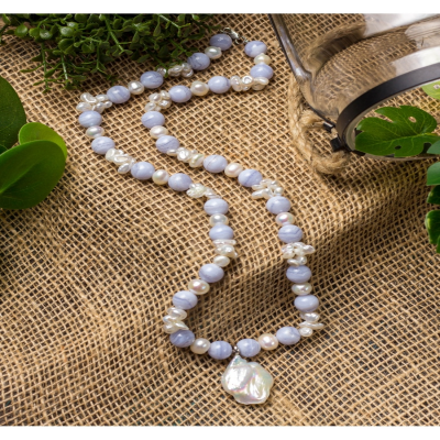 НОВИНКА! Представляем вашему вниманию изящное колье из голубого бразильского агата и жемчуга Барокко. Изысканное и очень нежное, оно украсит шею своей владелицы. Красивый самоцвет напоминает утонченные воздушные кружева. Это украшение отличается утонченностью и благородством. Длина изделия - 57 см. Размер камней - голубой агат - 10 мм. Размер подвески из жемчуга Барокко - 3х2 см. Замок - карабин, выполнен из серебра 925 пробы. Свернуть описание