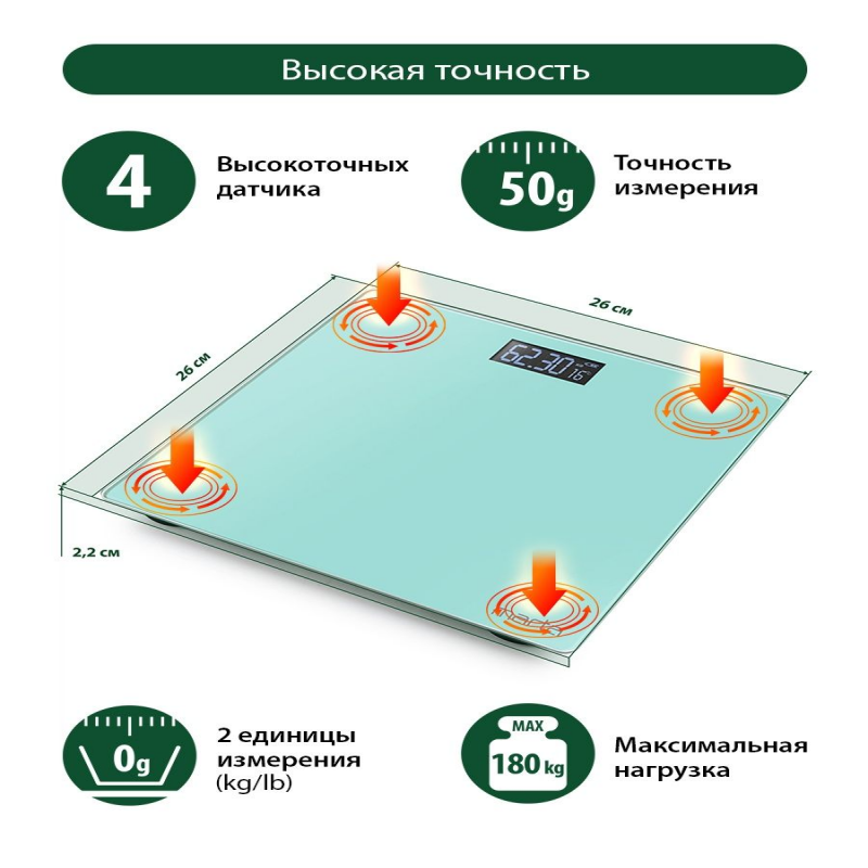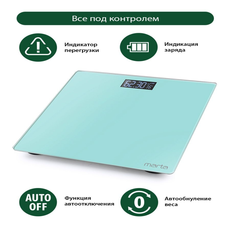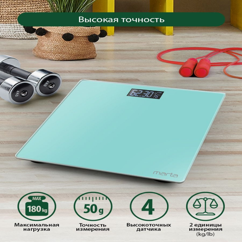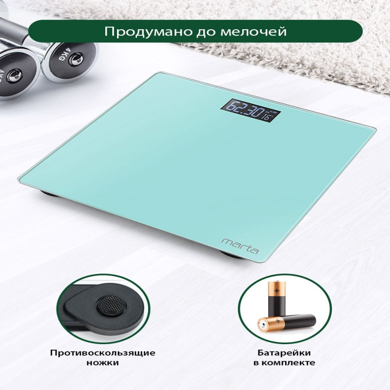 Весы напольные электронные стеклянные с термометром MARTA, для похудения, для фитнеса, для мужчин и женщин. Дисплей ЖК, Диапазон измерений 5-180 кг, Точность измерения 50 г, Индикация заряда батареи, Индикация перегрузки, Измерение ТЕМПЕРАТУРЫ воздуха, Режимы только масса тела, Изменение единиц измерения, Единицы измерения кг/фунты, Светящиеся символы дисплея, Размер дисплея 24х60 мм, Тип элементов питания AAA, Количество элементов питания 2, Напряжение элементов питания 1,5 В, С рисунком на корпусе, Автоматическое включение, Автоматическое выключение, Материал платформы стекло.Электронные напольные весы с платформой из полированного стекла 26х26 см, встроенной функцией индикации температуры помещения и крупным жидкокристаллическим дисплеем с легко читаемыми цифрами. Обеспечивают взвешивание до 180 килограммов с точностью до 50 граммов. Благодаря разнообразию расцветок и привлекательному дизайну весы легко впишутся в любой интерьер.Весы электронные бытовая техника для мужчин, не пояс для похудения для женщин, стеклянные ЗОЖ, не диагностические весы на подарок на новый год, не умные весы подарок на 8 марта, весы напольные для девочек, товары для красоты и здоровья, товары для похудения, товары для спорта, товары для фитнесса, спортивные товары, для дачи, весы для отеля, весы для гостиниц. Товар для Красоты и Здоровья, Для Фитнеса. Хороший Подарок.На подарок на новоселье, на Подарок на Новый год. Не умные весы, не диагностические, не Xiaomi. КРУПНЫЕ цифры. Установите весы на САМУЮ ТВЕРДУЮ И РОВНУЮ ПОВЕРХНОСТЬ для точного измерения веса, пожалуйста . Свернуть описание