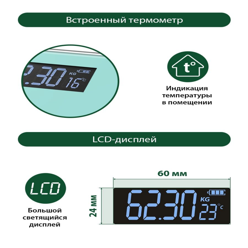 | Доп. опции весов | индикатор перегрузки и заряда батареи; индикация температуры помещения; Светящиеся символы дисплея |