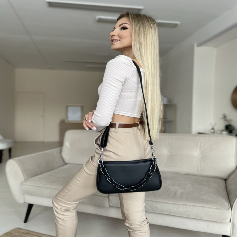 Если Вы заметили, что цепь слегка загрязнена, то просто протрите ее влажной салфеткой. Небольшая женская сумочка на плечо. Очень элегантная и необычная сумочка. В комплекте имеется два ремешка: классический ремешок регулируется, ремешок косичка не регулируется (стандартная). Также есть декоративный элемент цепочка. Сумочку можно носить тремя способами: на классическом ремешке, с ремешком косичка, а также можно просто носить в руке на цепочке. Сумка идеально подойдёт для прогулки, работы, также станет идеальным спутником на каждый день. Компактная, легкая, вместительный вариант женской сумочки. Свернуть описание эко кожаСостав