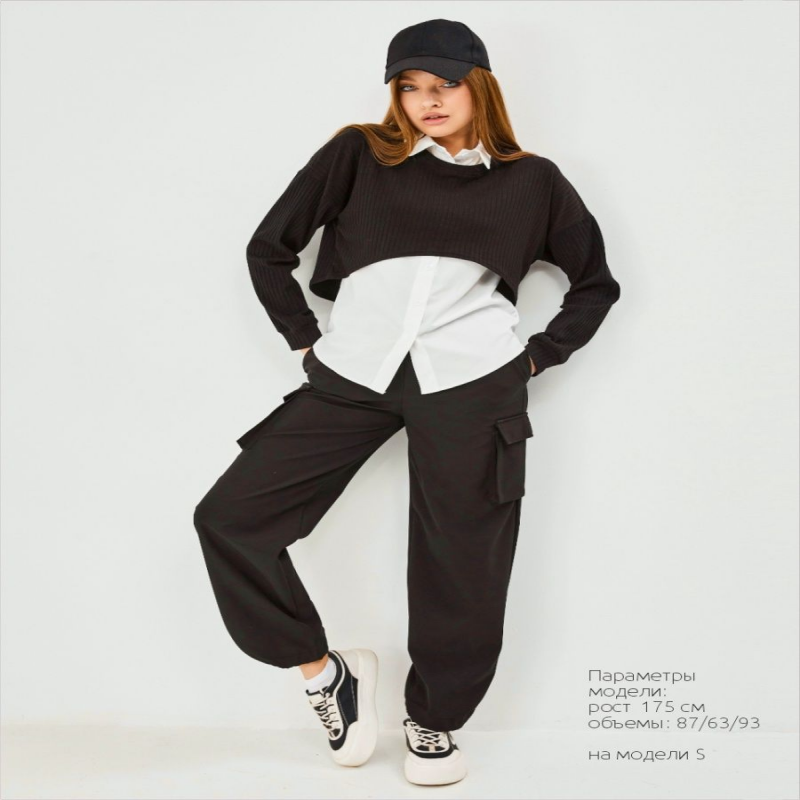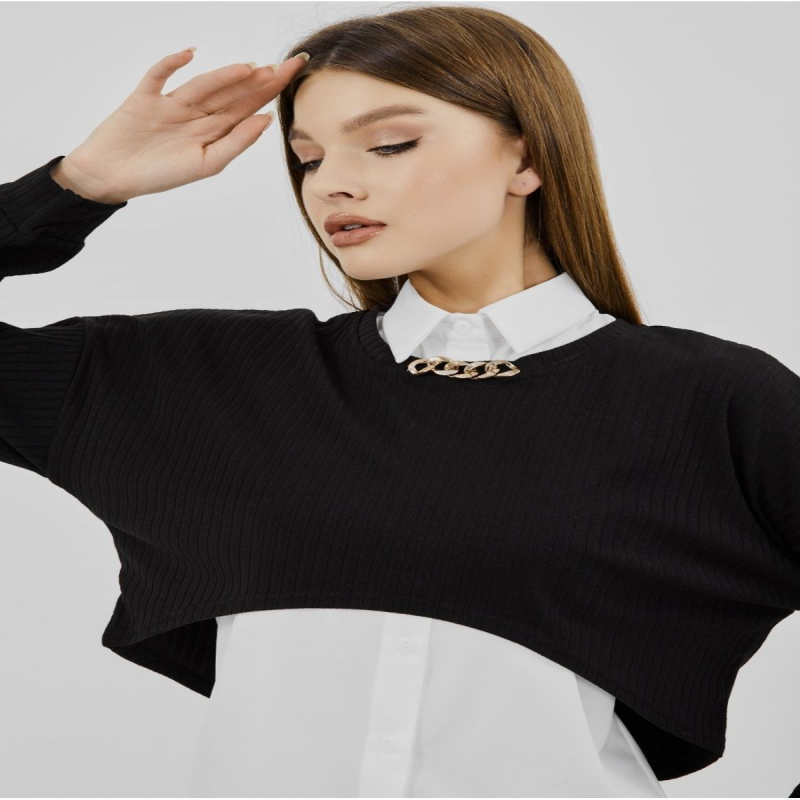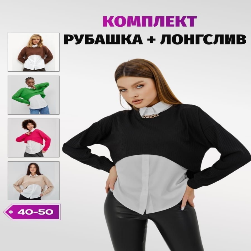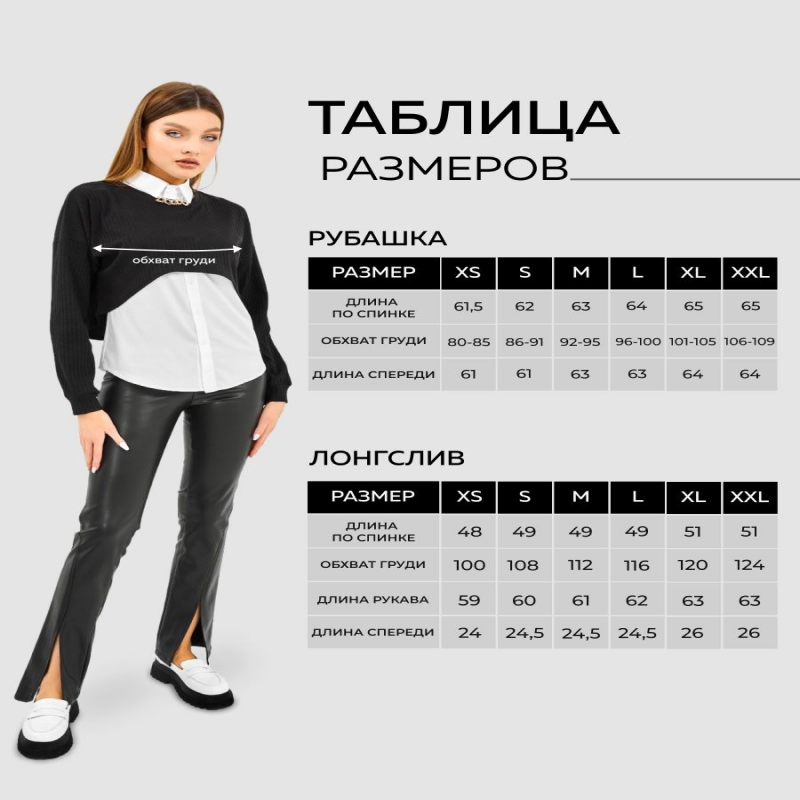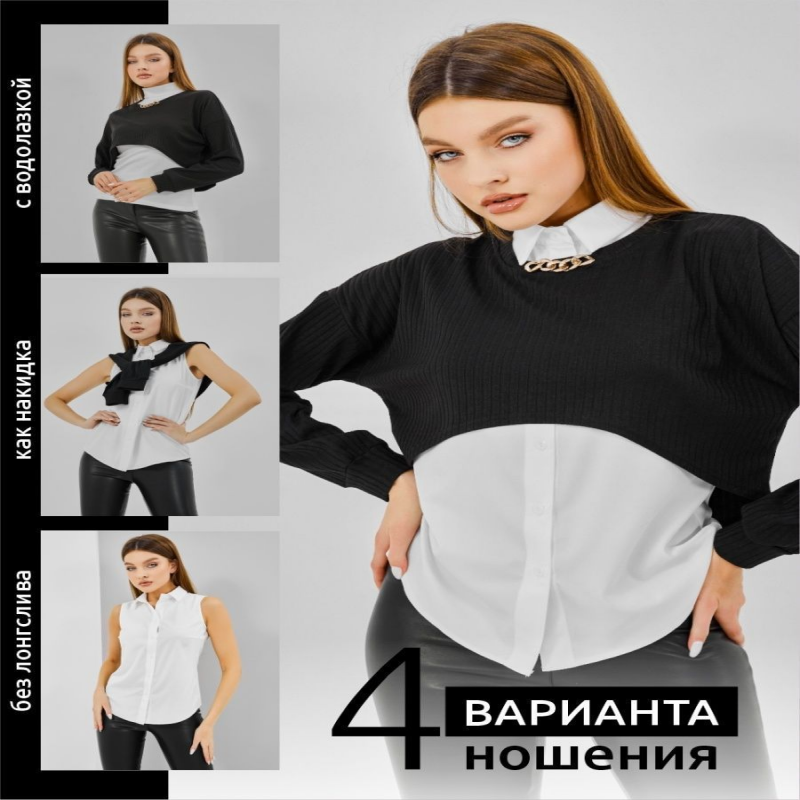 | Комплектация | укороченный лонгслив оверсайз с длинным рукавом, круглым вырезом и цепочкой 1 шт; женская белая рубашка без рукавов 1 шт |